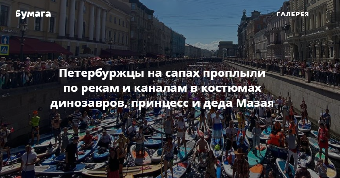 В Петербурге днем 8 августа прошел фестиваль сап-серфинга «Фонтанка-SUP», в котором приняли участие почти 2 тысячи человек. Горожане плыли по рекам и каналам в костюмах динозавров, индейцев, супергероев, принцесс Disney, а также деда Мазая. Некоторые взяли на сапборды своих питомцев — от собак до ежей.