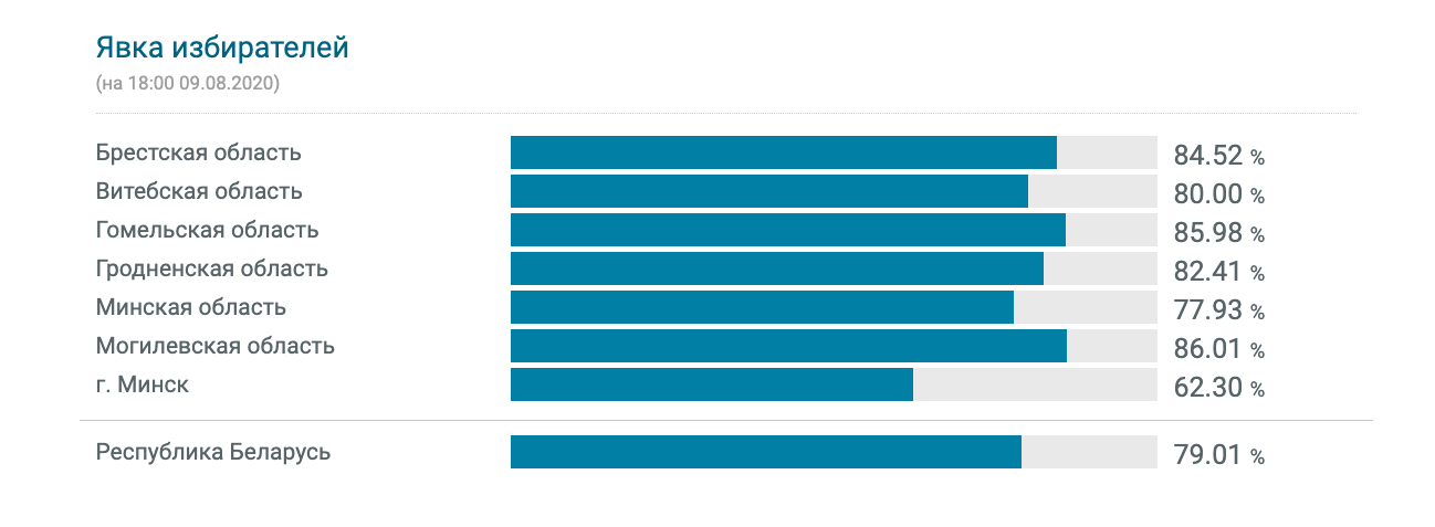 По официальным данным, явка на выборах на 18:00 составила 79,01%. У избирательных участков образовались километровые очереди из желающих проголосовать. Глава ЦИК Белоруссии Лидия Ермошина назвала очереди «саботажем и провокацией» оппозиции.