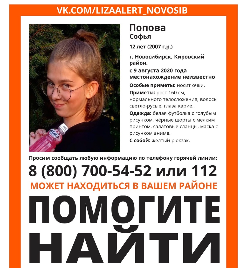 «Помогите найти ребенка! Пропала Попова Софья 12 лет», — сообщили волонтеры «Лизы Алерт» 10 августа.