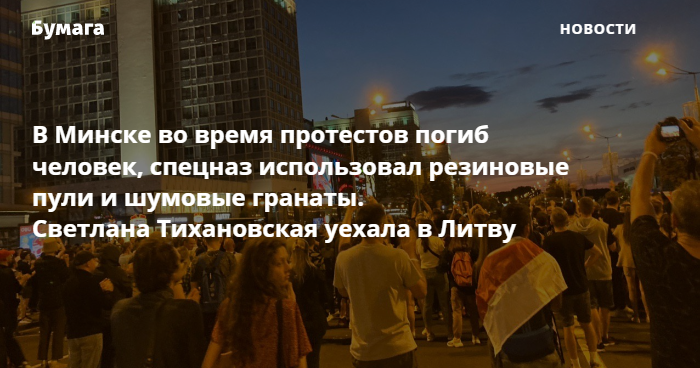 «Медуза» опубликовала фотографии со второй ночи протестов в Беларуси, а также рассказала о неработающем в Беларуси интернете. «Медиазона» ведет онлайн о массовых митингах в республике, а также публиковала монолог участника протестов. Местоположение пропавшего журналиста «Медузы» Максима Солопова, освещавшего протесты, до сих пор неизвестно.