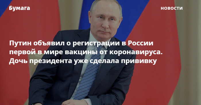 «Насколько мне известно, сегодня утром впервые в мире зарегистрирована вакцина против новой коронавирусной инфекции», — сказал Путин. Он отметил, что вакцина «работает достаточно эффективно, формирует иммунитет устойчивый и, повторяю, прошла все необходимые проверки». Президент сказал, что рассчитывает на массовый выпуск российской вакцины от коронавируса в ближайшее время, вакцинировать людей будут добровольно.