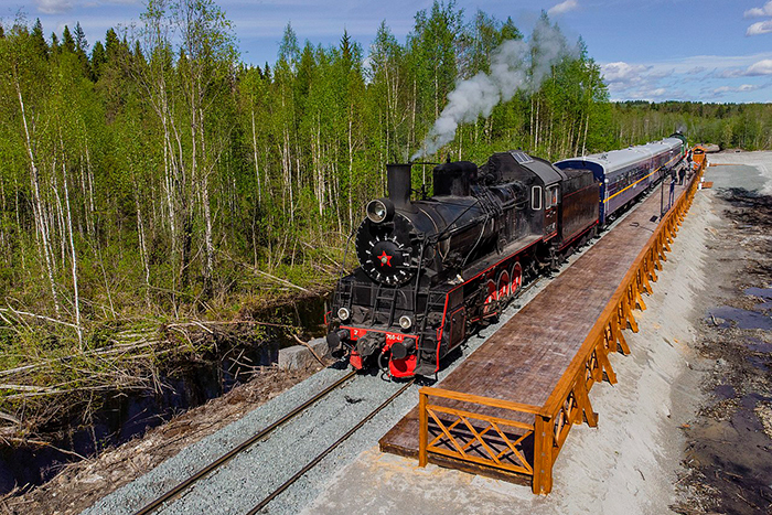 — Рускеальский экспресс едет до горного парка «Рускеала». Поезд едет на паровозной тяге — можно полюбоваться действующим паровозом. Интерьер выдержан в стиле XIX–XX веков, очень атмосферно. Присутствует вагон-ресторан, где продают приятную выпечку и напитки. А из окна открываются прекрасные виды. В пути поезд всего час. Стоит отметить очень удобное расписание поезда. Время подобрано так, что после «Ласточки» из Санкт-Петербурга до Сортавалы и в другую сторону ожидание совсем небольшое — не приходится долго ждать и хватает времени на красивые снимки.