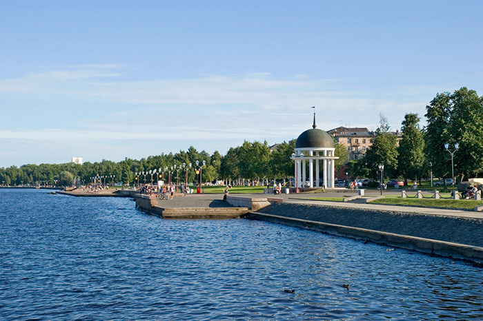Гранитная набережная с дорожками, фонарями и скамейками. Сюда можно добраться прямо от вокзала по проспекту Ленина — прогулка займет полчаса. На набережной можно погулять, любуясь панорамным видом на Онежское озеро, а также изучить галерею арт-объектов — подарки от разных городов и стран: среди них — алюминиевые деревья и рыбаки из стали. Сейчас набережную ремонтируют, поэтому часть пространства перекрыта. Неподалеку находится городской причал.