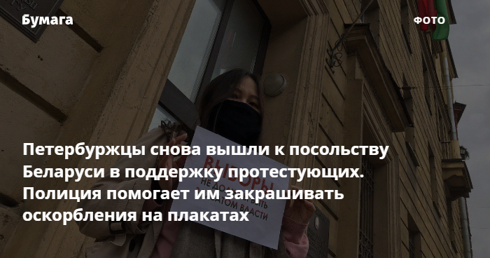 «Северо-Запад. МБХ медиа» пишет, что полицейские помогают закрашивать активистам оскорбительные лозунги. «Беларусь будет свободна — это пожалуйста. А вот мразь, крыса и убийца — не надо. Вы же петербурженки. Не стоит так», — цитирует издание сотрудника МВД.