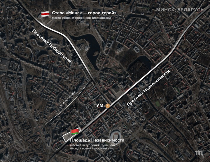 16 августа в Минске прошли сразу два митинга: сначала на площадь Независимости пришли сторонники Александра Лукашенко — по официальным данным, более 70 тысяч человек, по оценкам СМИ, не более 30 тысяч.Позже у стелы «Минск — город-герой» собрались сторонники Светланы Тихановской. По подсчетам издания Tut.by, на эту акцию пришли не менее 200 тысяч человек. МВД своих оценок не давало. Протестующие прошли шествием до площади Независимости, где ранее митинговали их оппоненты. Вот маршрут «Марша свободы».