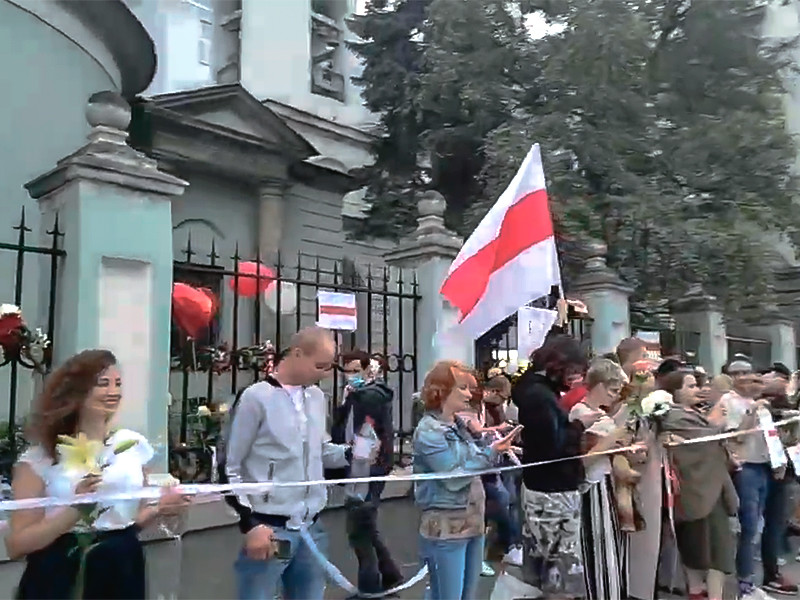 Активисты выстроились в цепочку солидарности напротив посольства на Маросейке. В руках собравшиеся держат белые и красные гвоздики и розы, плакаты с политическими лозунгами, воздушные шары. Люди продолжают прибывать.