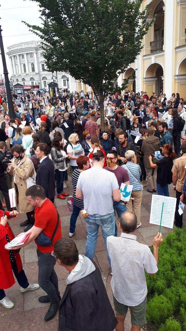 В тот же день более 300 человек пришли к «Гостиному двору» на акцию солидарности с протестующими в Беларуси, Хабаровске и Куштау.