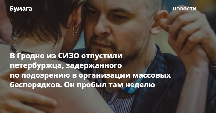 Из СИЗО в белорусском городе Гродно вечером 17 августа выпустили петербуржца Алексея Абрамова, задержанного милицией по подозрению в организации массовых беспорядков. Об этом «Бумаге» сообщила его подруга Дарья Змитрович. Внимание на это обратила «Новая Газета».
