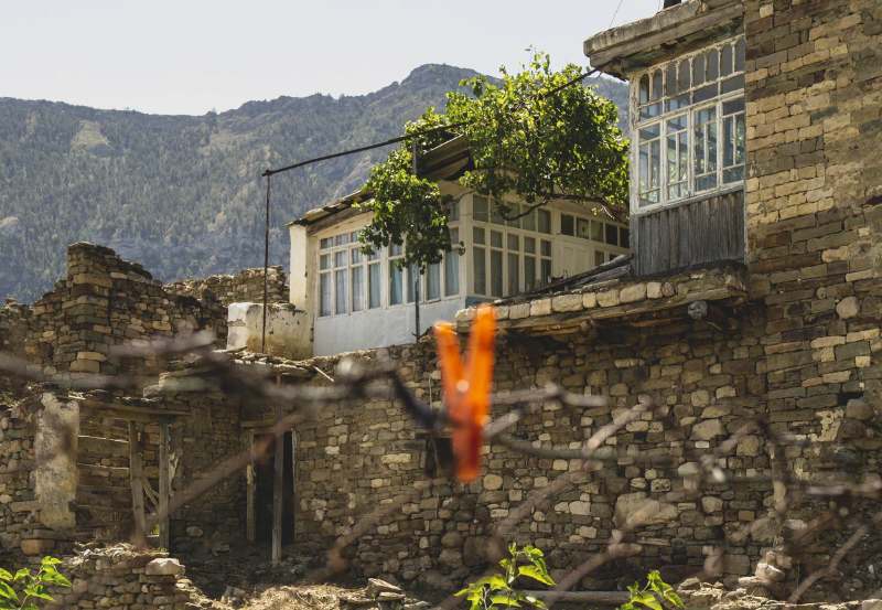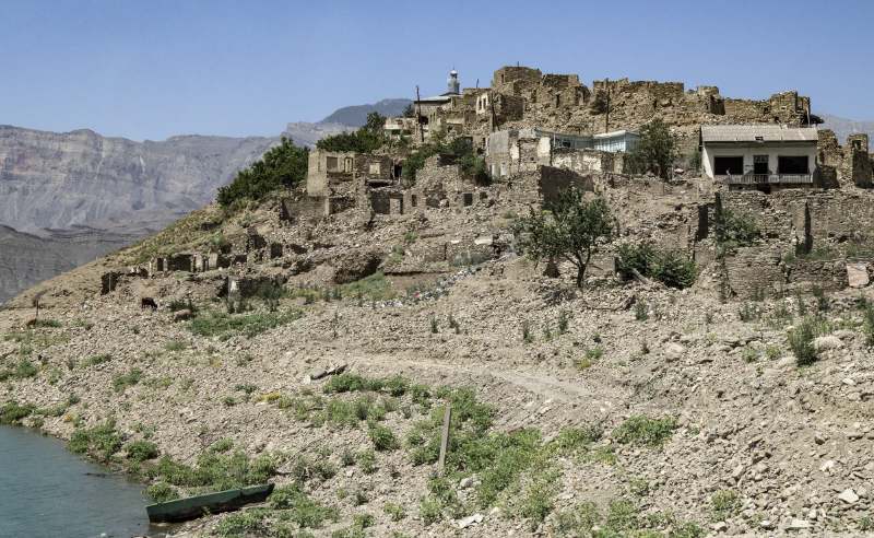 Магомед ведет меня по узким пыльным улочкам старого села, которого официально больше нет. Они расположены на холме, поэтому не ушли под воду. Большинство жителей давно прокинули это место: отрезанное от инфраструктуры, оно перестало быть удобным для жизни. Но не растеряло очарования. Тут и там среди серых каменных руин видны дома, где до сих пор живут люди. Яркими зелеными пятнами цепляют взгляд абрикосовые деревья. Все еще работает маленькая мечеть, которой не одна сотня лет.