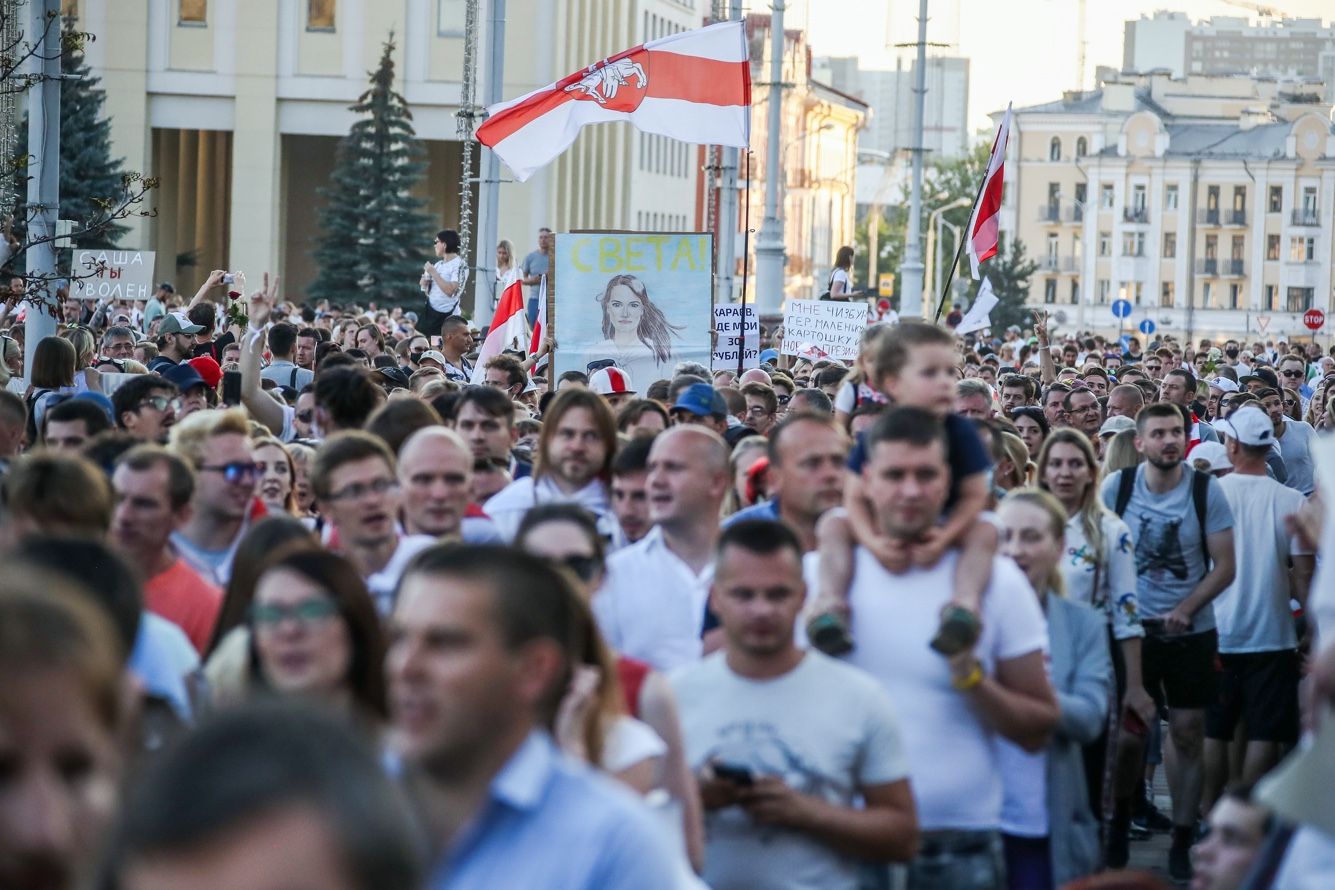 В это время люди у Дома правительства скандируют: «Лукашенко в автозак!» У подножья костела семья с ребенком трех лет — на щеках у него бело-красно-белый флаг. Мы идем ближе к памятнику Ленина. Его облепили фотографы, толпа скандирует «На Володарку!» и разворачивается в сторону следственного изолятора на улице Володарского. Там сидит блогер Сергей Тихановский — муж Светланы Тихановской, который изначально сам планировал участвовать в выборах президента, но был арестован.