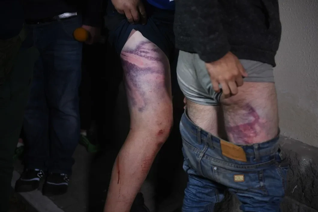 Участники акций протеста демонстрируют следы от побоев после освобождения из ИВС на улице Окрестина. Фото: РИА Новости