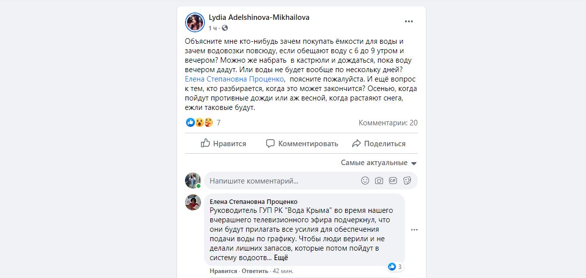 Так, к Проценко обратились с вопросом на ее странице в Facebook о том, почему российские власти решили устанавливать емкости воды и развозить воду в Крыму, если до этого пообещали, что она будет подаваться с 6 до 9 утром и вечером, и не означает ли это, что воды может не быть несколько дней.