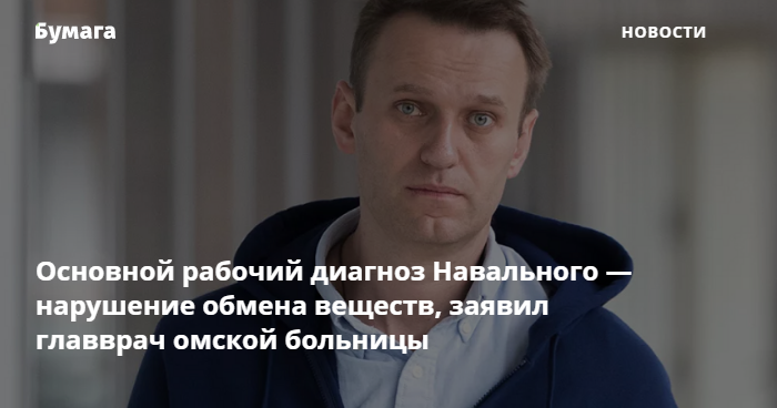 Главный врач омской больницы, в которой находится Алексей Навальный, Александр Мураховский назвал основным рабочим диагнозом политика нарушение обмена веществ. Об этом сообщает ТАСС, полный комментарий Мураховского опубликовал телеграм-канал «Город55».