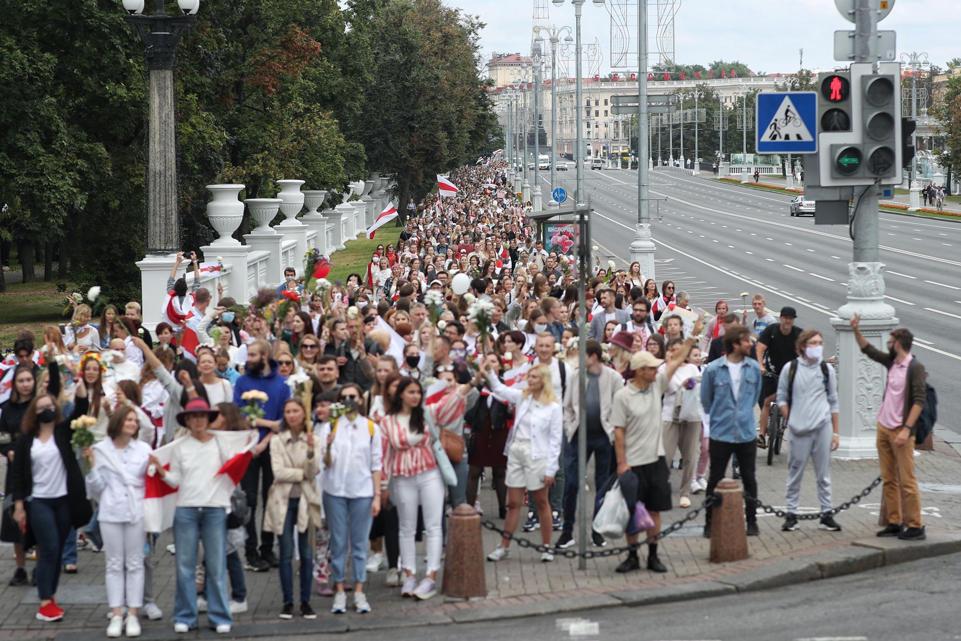 Евгений Фельдман для «Медузы» В Минске днем 22 августа несколько сотен человек, среди которых подавляющее большинство составляли женщины, собрались в «живую цепь» возле Комаровского рынка. После этого они прошли маршем по проспекту Независимости в знак поддержки бастующих рабочих.