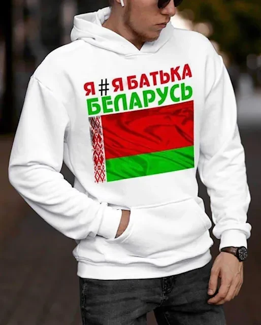 Во-вторых, на лукашенковских митингах, которые организуют по принципу «кто не пойдет, того с работы уволим», появился мерч, над которым второй день хохочет вся страна. Толстовки и футболки с красно-зеленым флагом и хэштегом #ябатька. Да, трудно перестать смеяться. Но если хоть на секунду всерьез подумать, что это за фигня такая, становится понятно: это самый что ни на есть российский продукт.