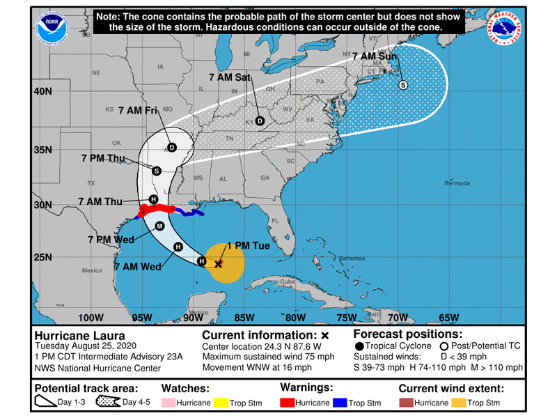 Центр по отслеживанию ураганов США заявил, что "Лора" усилится до третьей, предпоследней категории мощности, до того, как ударит поздним вечером в среду или рано утром в четверг с силой ветра до 185 км в час. Почти все метеорологи полагают, что в ближайшее время этот ураган будет лишь усиливаться.