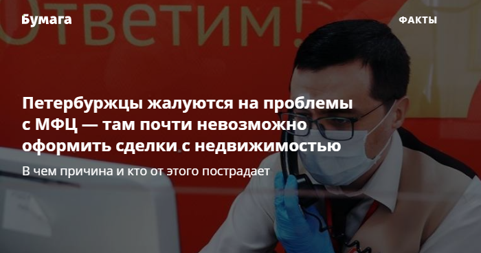 При этом услуга регистрации права на недвижимость — самая востребованная в петербургском МФЦ. Это в ответах на жалобы на своем сайте признают в самом центре, указывая, что к подобному спросу привел двухмесячный простой из-за ограничений против коронавируса. Как пишет «Фонтанка», услуги Росреестра были востребованы и до пандемии и составляли около трети всех обращений в МФЦ.