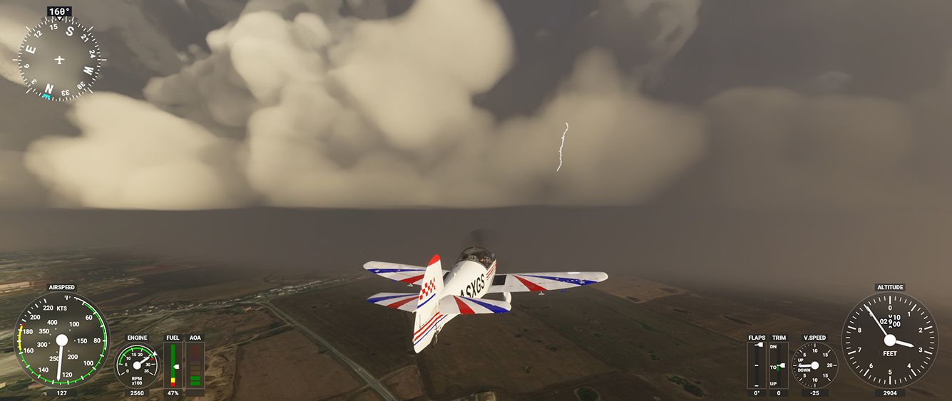 Игра еще и синхронизирует погоду виртуального мира с погодой реального: если за окном дождь, то можно запустить MSFS над своим домом и влететь в тот же дождь. Журналист Eurogamer даже отправился к тропическому шторму, хотя у меня поймать ураган или шторм пока не вышло.