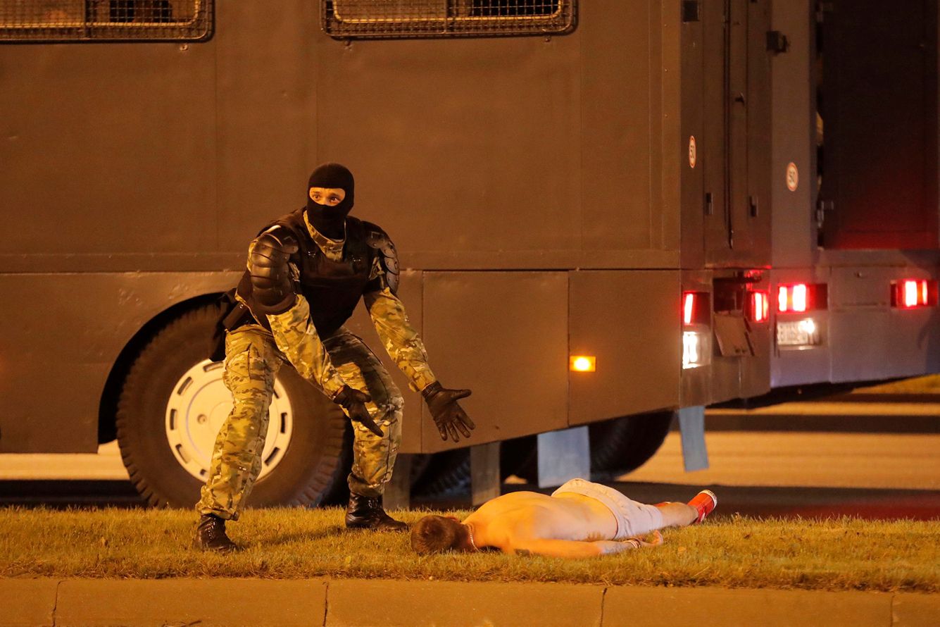 The above photograph, taken by Vasily Fedosenko for Reuters, has become one of the most famous snapshots from the start of the protests Belarus. It was taken during the night of August 9–10, near the Hero City Obelisk in downtown Minsk, where most of the mass arrests took place. The photo shows an officer from the security forces in a black balaclava, gesturing towards a half-naked protester, who is lying on the ground.