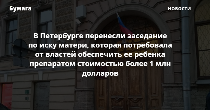 В Куйбышевском районном суде перенесли заседание по иску петербурженки Светланы Гепаловой, которая потребовала от властей обеспечить ее ребенка препаратом Zolgensma стоимостью более миллиона долларов. Об этом сама женщина рассказала «Бумаге».
