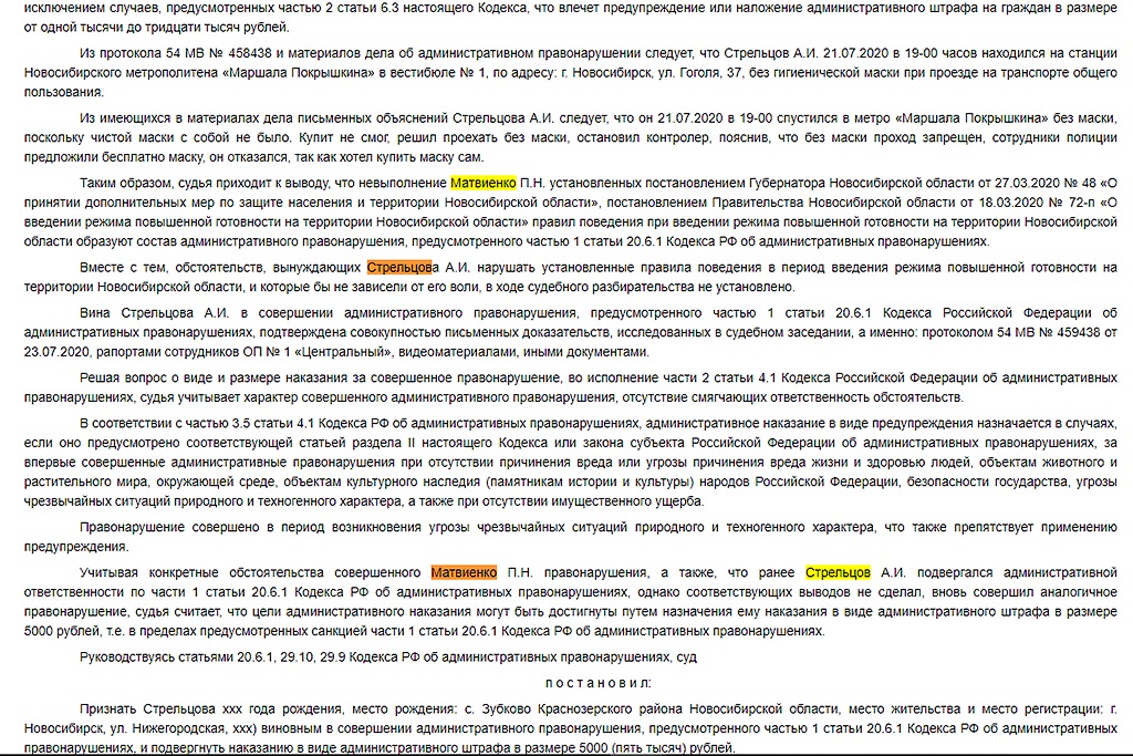 Центральный районный суд Новосибирска 20 августа вынес решение по административному делу Александра Стрельцова. Его признали виновным в нарушении ч. 1 ст. 20.6.1 КоАП РФ (несоблюдение «масочного режима») и назначили 5 тыс. рублей штрафа. Часть данных из постановления была скопирована из прошлого решения о нарушении «масочного режима», установила Тайга.инфо.