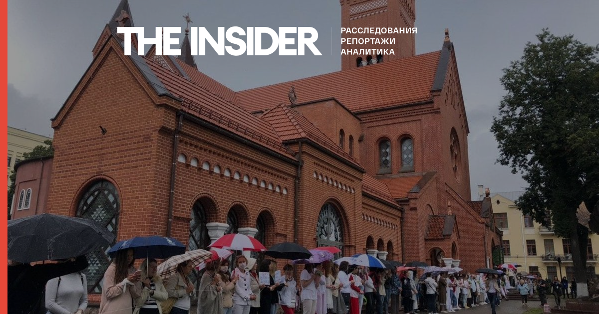 Жительницы Минска выстроились в живую цепь у костела святого Симеона и святой Елены, где вечером 26 августа сотрудники ОМОНа запирали журналистов и демонстрантов во время разгона акции протеста. Об этом сообщает корреспондент The Insider.
