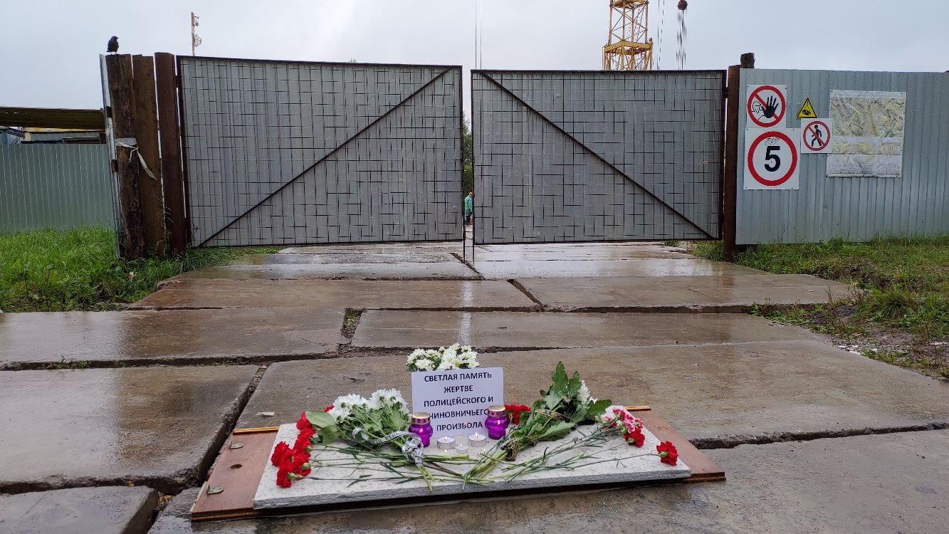 Мемориал перед воротами стройплощадки, возле которой был задержан Сергей Пахолков. Фото: Евгений Доможиров