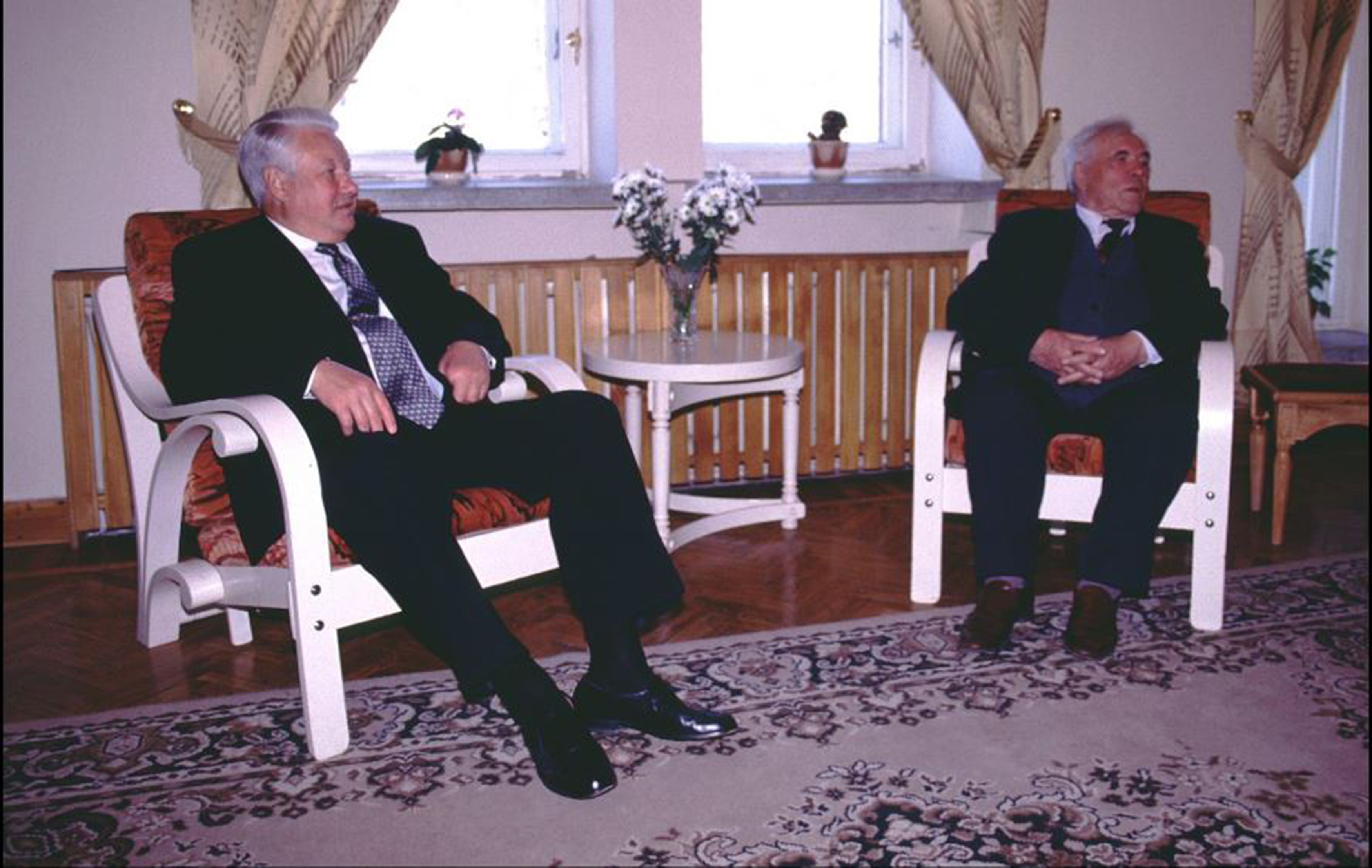 Такое же столпотворение наблюдалось в Овсянке за пять лет до смерти Виктора Петровича, 19 мая 1996 года, когда село посетил Борис Ельцин, приехавший как бы без повода, в гости к великому писателю. До президентских выборов оставался всего месяц, рейтинг Ельцина был не на высоте, и поэтому первый президент России искал поддержки у деятелей культуры, в том числе у Астафьева, живого классика военной прозы. На улицах Овсянки Ельцин общался с местными жителями. А встреча его с Астафьевым проходила за закрытыми дверями. Вот что говорил сам Виктор Петрович, когда его позже спрашивали о том, как она прошла.