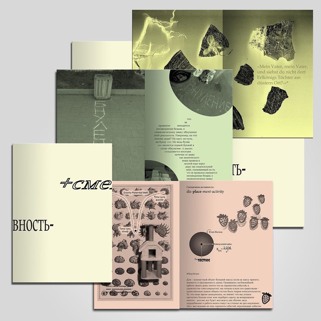 По задумке организаторов, печатрый зин — это «выставка take-away». Первый выпуск «+ смещенная активность -» курирует Лера Лернер. Его создавали петербургские художники Саша Зубрицкая, Таня Черномордова, Галя Яптик, Валя Луценко и Роман Осьминкин. Зин посвящен вынужденной самоизоляции и невозможности перемещаться в пространстве.