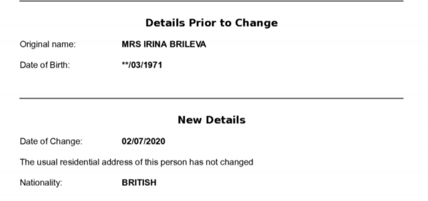 Запись о получении гражданства была внесена 2 июля в историю компании IBBA PRODUCTIONS LTD, которая зарегистрирована на Брилеву.