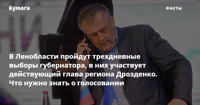 В выборах участвуют действующий губернатор Александр Дрозденко и три кандидата, которые в 2015 году уже проиграли ему с большим отрывом. Еще трех кандидатов, в том числе от КПРФ, не допустили до голосования из-за муниципального фильтра