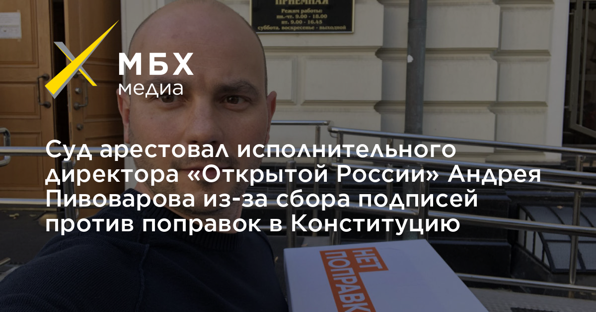 Тверской суд Москвы арестовал на 14 суток исполнительного директора «Открытой России» Андрея Пивоварова из-за сбора подписей против поправок в Конституцию 15 июля. Об этом сообщает корреспондент «МБХ медиа».