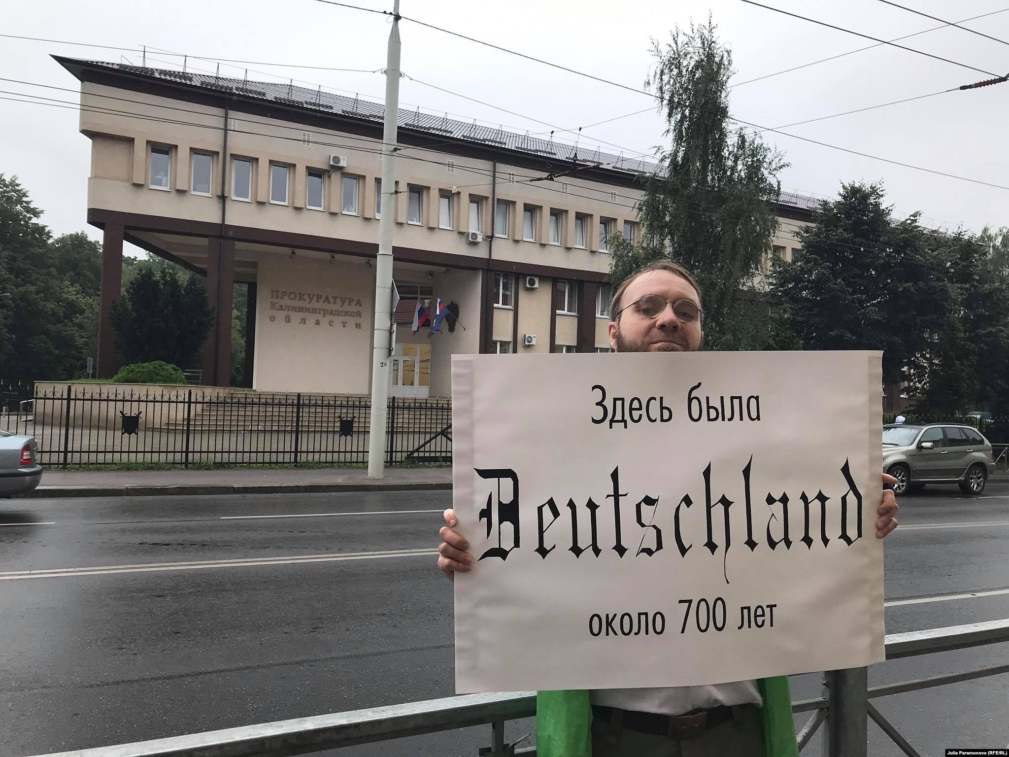 Румянцев принес плакат "Здесь была Deutschland около 700 лет" и заявил, что выступает против решения прокуратуры, которая потребовала закрасить надпись на немецком языке на стене новостройки.