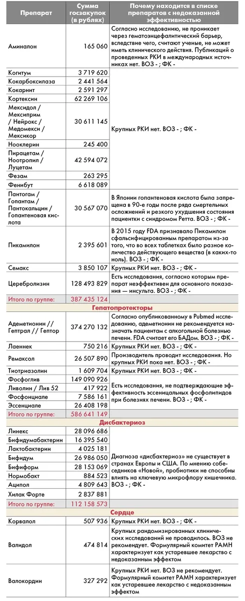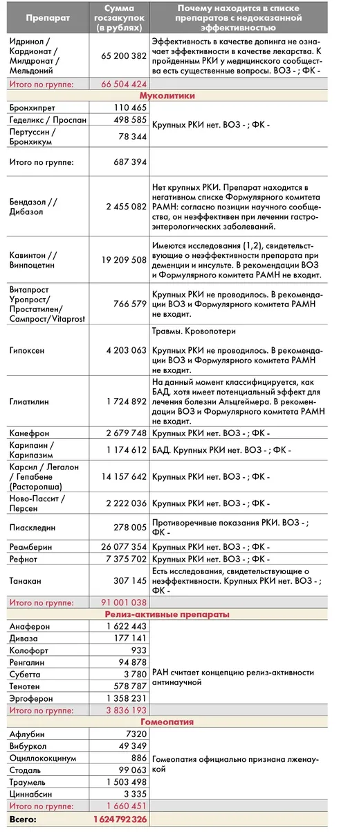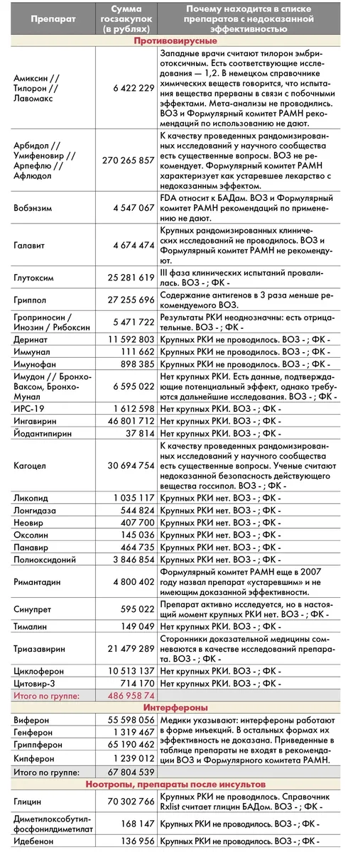 Список упомянутых препаратов: Амиксин, Тилорон, Лавомакс, Арбидол, Умифеновир, Арпефлю, Афлюдол, Вобэнзим, Галавит, Глутоксим, Гриппол, Гроприносин, Инозин, Рибоксин, Деринат, Иммунал, Имунофан, Имудон, Бронхо-Ваксом, Бронхо-Мунал, ИРС-19, Ингавирин, Йодантипирин, Кагоцел, Ликопид, Лонгидаза, Неовир, Оксолин, Панавир, Полиоксидоний, Римантадин, Синупрет, Тималин, Триазавирин, Циклоферон, Цитовир-3, Виферон, Генферон, Гриппферон, Кипферон, Глицин, Диметилоксобутилфосфонилдиметилат, Идебенон, Аминалон, Когитум, Кокарбоксилаза, Кокарнит, Кортексин, Мексидол, Мексиприм, Нейрокс, Медомекси, Мексикор, Нооклерин, Пирацетам, Ноотропил, Луцетам, Фезам, Фенибут, Пантогам, Гопантам, Пантокальцин, Гопантеновая кислота, Пикамилон, Семакс, Церебролизин, Адеметионин, Гептрал, Гептор, Лаеннек, Ремаксол, Тиотриазолин, Фосфоглив, Ливолин, Лив 52, Фосфонциале, Эссенциале, Линекс, Бифидумабактерин, Лактобактерин, Бифидум, Бифиформ, Нормобакт, Аципол, Хилак Форте, Бронхипрет, Геделикс, Проспан, Пертуссин, Бронхикум, Валидол, Валокордин, Корвалол, Идринол, Кардионат, Милдронат, Мельдоний, Адаптол, Актовегин, Афобазол, Бендазол, Дибазол, Кавинтон, Винпоцетин, Витапрост, Уропрост, Простатилен, Сампрост, Vitaprost, Гипоксен, Глиатилин, Канефрон, Карипаин, Карипазим, Карсил, Легалон, Гепабене (Расторопша), Ново-Пассит, Персен, Пиаскледин, Реамберин, Рефнот, Танакан, Анаферон, Диваза, Колофорт, Ренгалин, Субетта, Тенотен, Эргоферон, Афлубин, Вибуркол, Оциллококцинум, Стодаль, Траумель, Циннабсин
