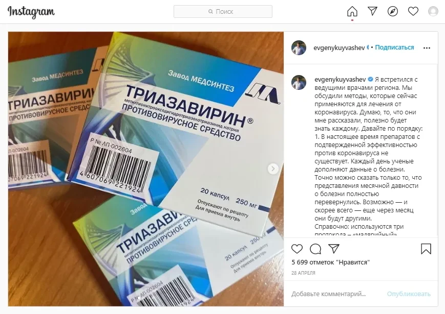 Интересно, что в своем посте губернатор несколько раз признавал, что доказанной эффективности «Триазавирин» не имеет, но при этом подчеркивал: «На войне все средства хороши».
