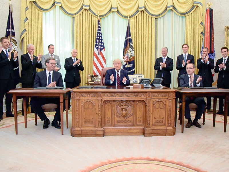 В социальных сетях Сербии распространилась фотография, на которой президент Сербии Александр Вучич сидит на стуле на расстоянии около полутора метров от стола президента США Дональда Трампа на приеме в Овальном кабинете.