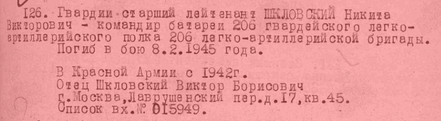 И здесь мы сталкиваемся с такой укоренившейся в веках, азиатской что ли, привычкой не раскрывать сведения, особенно связанные с войной, поэтому и данные о погибших, плененных, пропавших без вести красноармейцах, солдатах и офицерах лишь недавно были рассекречены для широкой публики и с 2007 года выложены в интернет. Их выкладывают постепенно, не все сразу. Есть такой важный для исследователей инструмент – ОБД «Мемориал», Общий банк данных «Мемориал» о «невозвратных потерях», такая бюрократическая формула – то есть о погибших, плененных и пропавших без вести. В этих списках значится и Никита Викторович Шкловский, существует запись от 1945 года: «старший лейтенант гвардии, командир батареи, член ВКП(б), место смерти – местечко в Пруссии Шанаух», я даже попытался найти, это вроде бы на территории современной Польши, и есть точная дата – 8 февраля 1945 года.