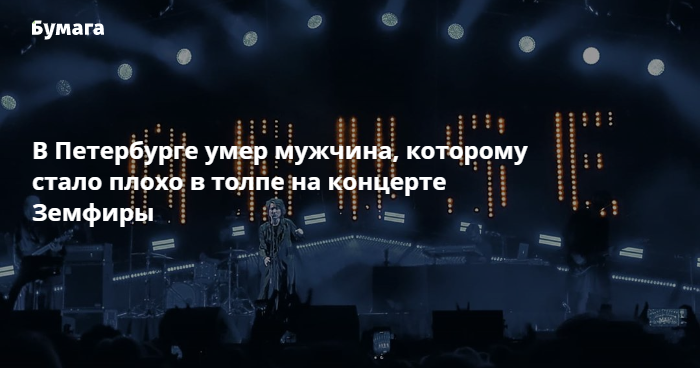 Вечером 6 сентября в Петербурге умер мужчина, которому стало плохо в толпе на выступлении Земфиры в «Севкабель Порту». Об этом пишет издание 78.ru со ссылкой на источник в экстренных службах. Информацию «Бумаге» подтвердили в пресс-службе фестиваля Stereoleto.