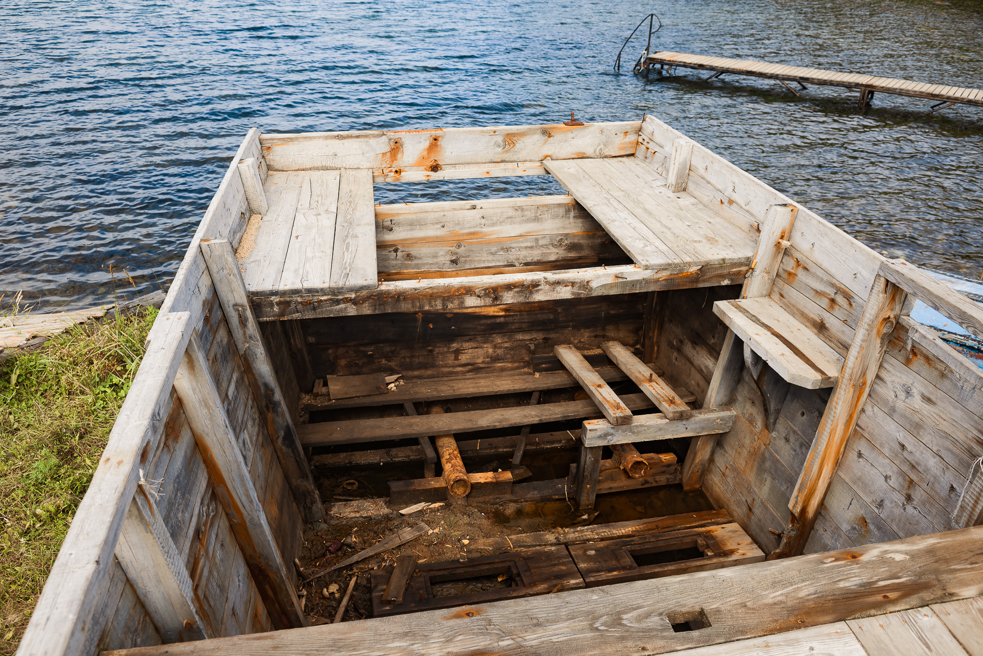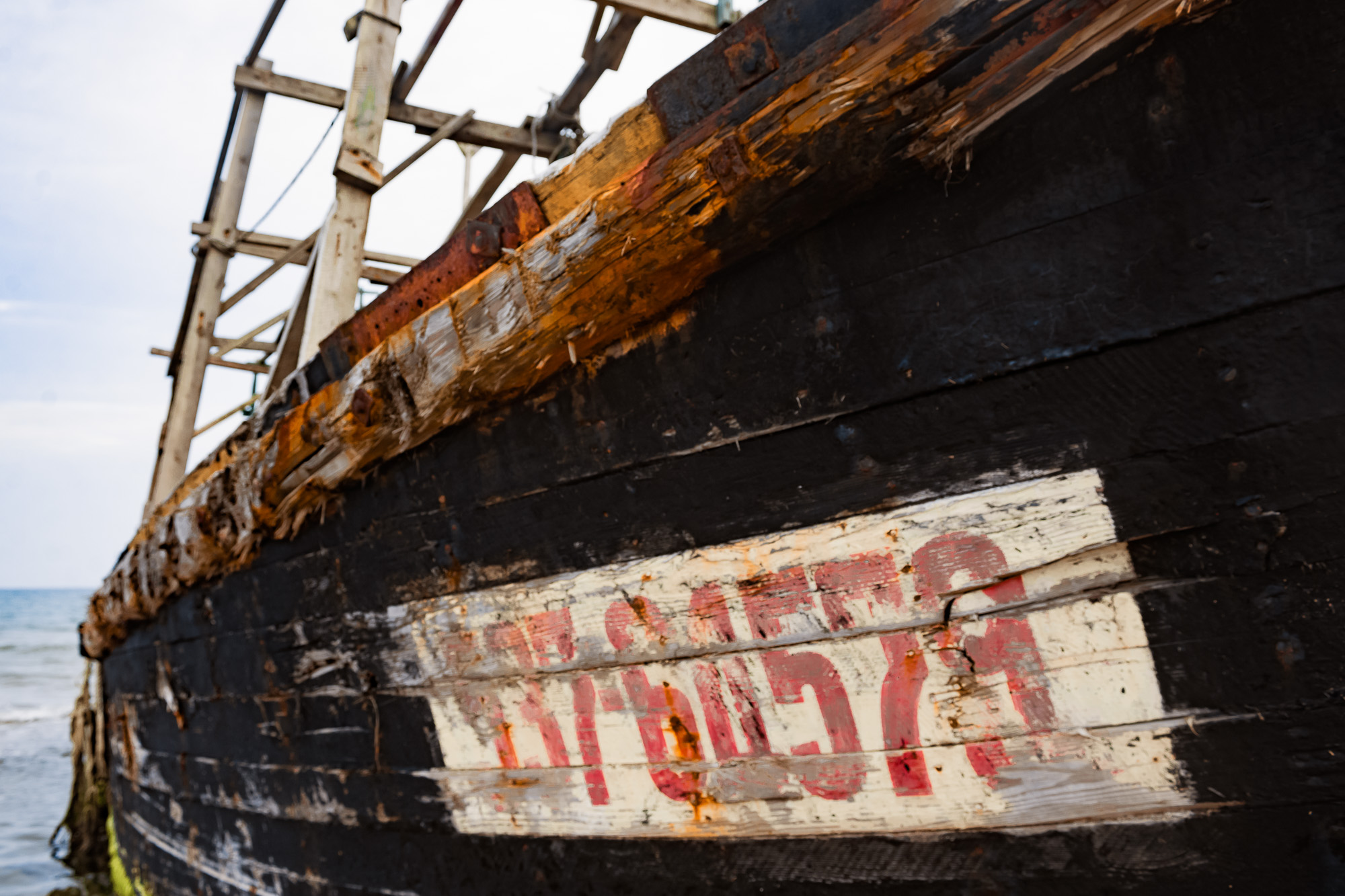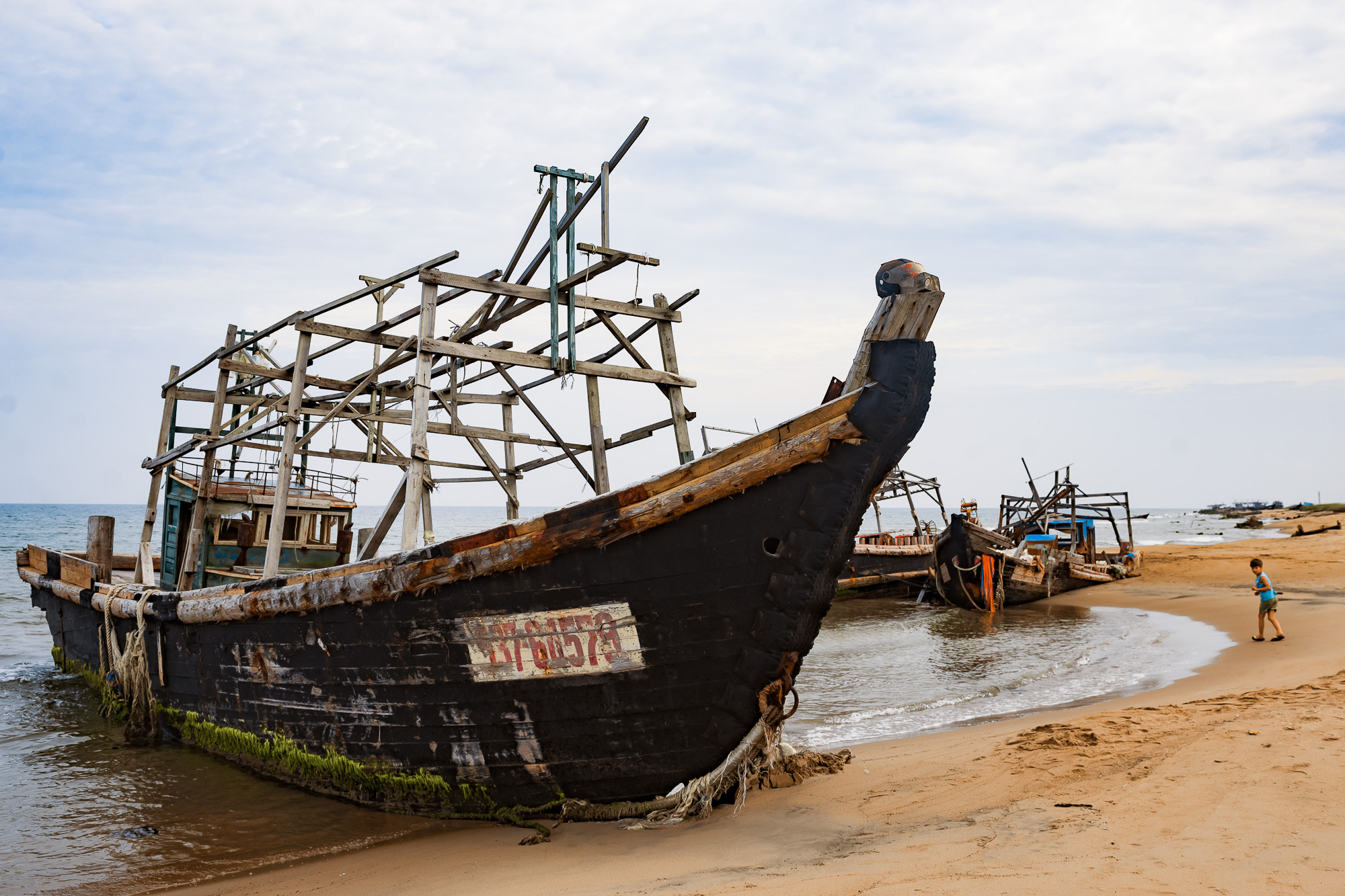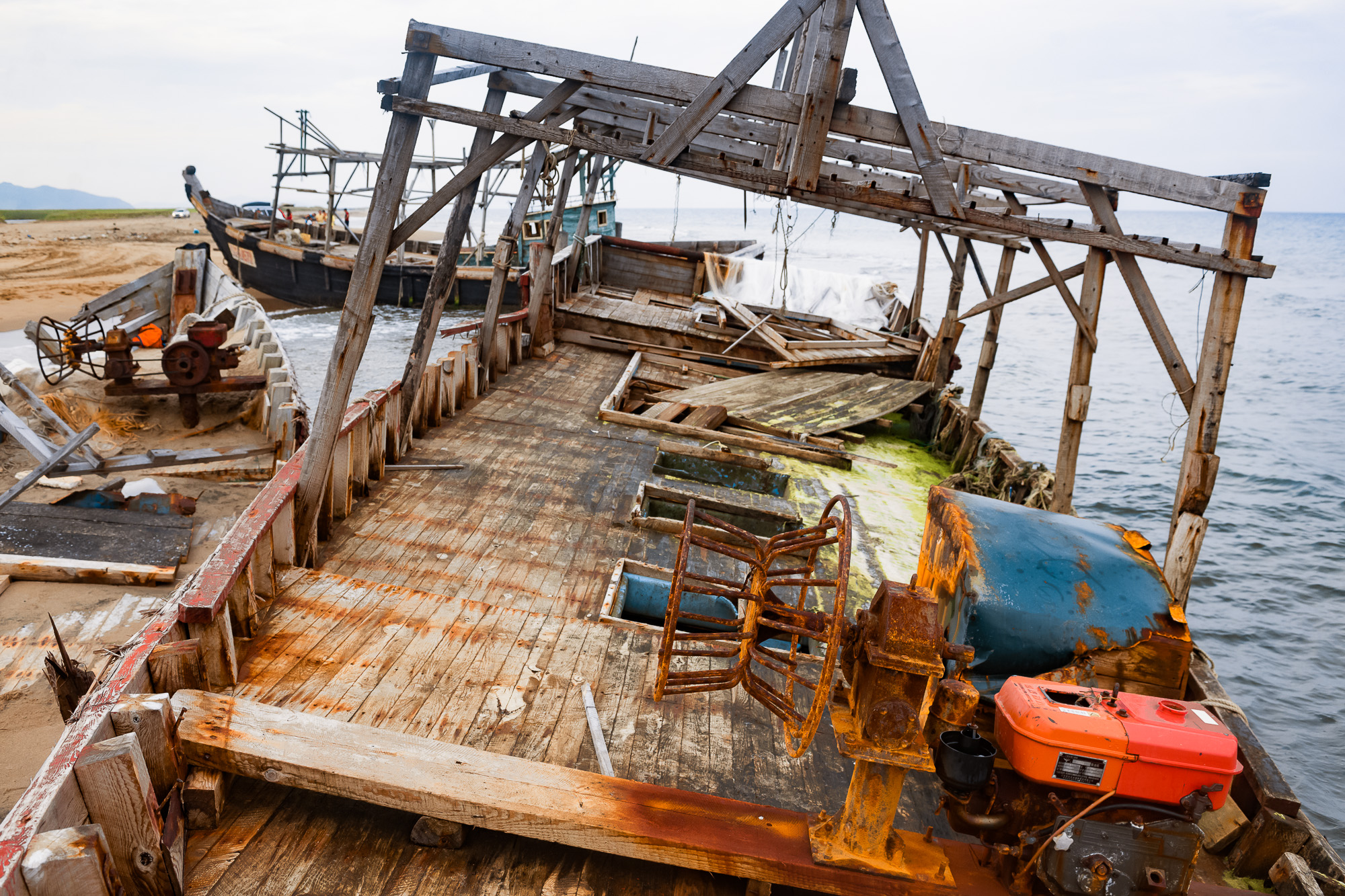 Прямо на берегу, частично погруженные в воду, лежат хорошо сохранившиеся шхуны. Острые носы обиты автомобильными покрышками, борта замазаны чем-то черным. На палубе, да и в каютах, места не больше, чем на пару человек. Над палубой торчит деревянная конструкция, напоминающая скелет из досок. Это перекладины для сушки кальмара прямо в море.