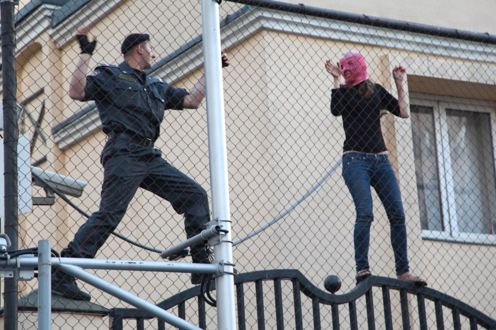 Народу на оглашении было очень много, как на митинге. В какой-то момент на заборе ровно напротив входа в суд появилась изящная фигура — юная девушка в розовой балаклаве балансировала на виду у всех, и полиция долго ничего не могла с этим сделать. Потом двое особо ловких омоновца таки залезли на забор и столкнули девушку вниз, спрыгнув за ней. Так все трое оказались на территории Турции — это было турецкое посольство. Вышел посол и сообщил, что не даст увести активистку, и омоновцы ушли ни с чем. Потом посол Турции предложил девушке тихо выйти с территории через задний выход, но полиция оцепила всё посольство, и девушку тут же задержали.