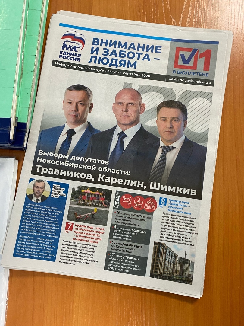 "На первой полосе изображены депутат Заксобрания Андрей Шимкив, депутат Госдумы РФ Александр Карелин и губернатор Андрей Травников, который возглавляет региональное отделение ЕР (все трое представляют топ-3 списка ЕР на выборах в ЗС). Мы возмутились, но в итоге газеты выкинуть пришлось самим студентам", – комментирует Сивенок.