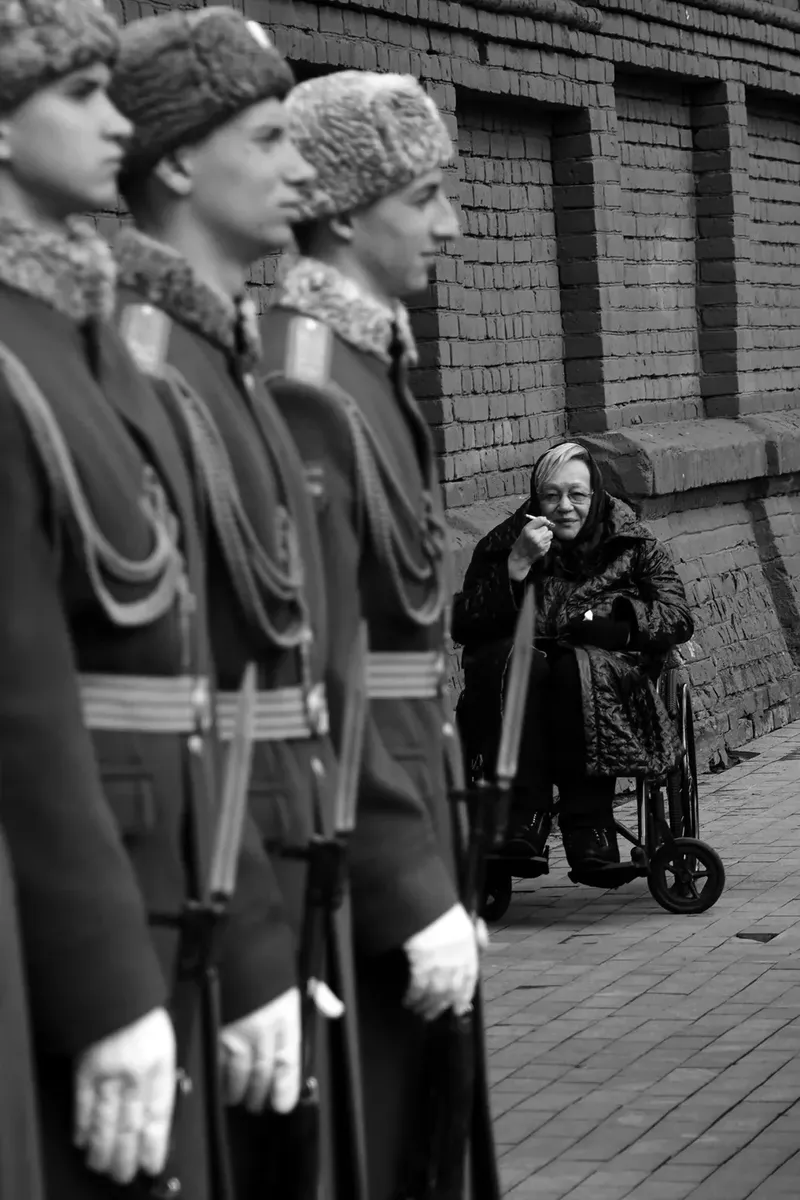 Тут в инвалидном кресле с охапкой белых роз подкатила Галина Борисовна Волчек проститься с другом и режиссером, в чьем первом не сохранившемся фильме, снятом еще на Высших режиссерских курсах, играла Варвару, жену Васисуалия Лоханкина, с Евгением Евстигнеевым.