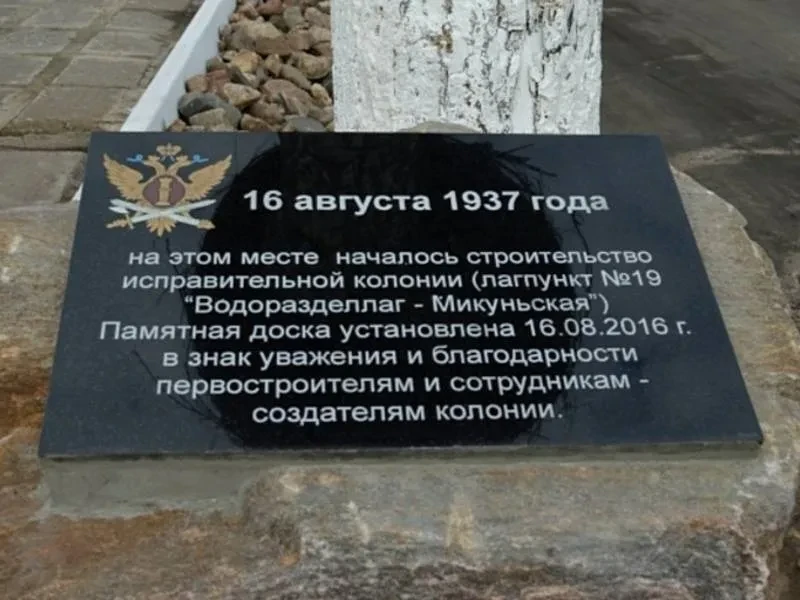 Четыре года назад, 16 августа, в поселке Микунь близ Сыктывкара открыли странный памятный знак. У входа в женскую колонию № 31 установили мемориальную доску в честь (sic!) 79-летия начала строительства гулаговского лагпункта № 19 «Водоразделлаг — Микуньская». На мраморной плите высечено: «Доска установлена в знак уважения и благодарности первостроителям и сотрудникам — создателям колонии».