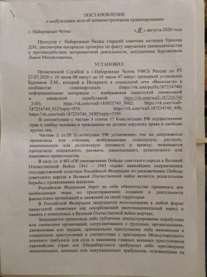 В прокуратуре Набережных Челнов, куда Бурлаков явился 18 августа, выяснилось, что против него возбудили административное дело о публичном демонстрировании нацистской символики (ст. 20.3 КоАП) из-за постов в паблике «левомаргинал». В публикациях, которые вменили Бурлакову, изображены, в частности, съезд правящей партии в нацистской Германии с подписью «Марксизм без ревизии», а также изображения свастики, фотографии лидеров НСДАП и флагов Ку-клукс-клана. Проверку проводили в УФСБ по Республике Татарстан.