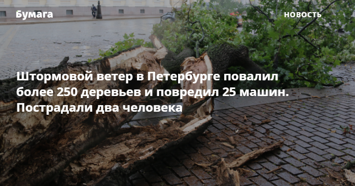 Во время шторма в Петербурге 10 сентября пострадали два человека. Ветер повалил более 250 деревьев и повредил 25 автомобилей, сообщают ТАСС и «Фонтанка» со ссылкой на пресс-службу МЧС.