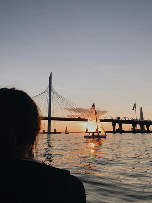 А бывает, что выходишь в сильный свежий ветер, яхту сильно кренит, тебя заливает волна. В такие моменты пытаешься совладать с двумя стихиями и трансформировать их в свое движение. Иногда выходишь на воду без настроения, но видишь закат, градиент неба, «Лахта-центр», мост, линию горизонта — и просто погружаешься в это.
