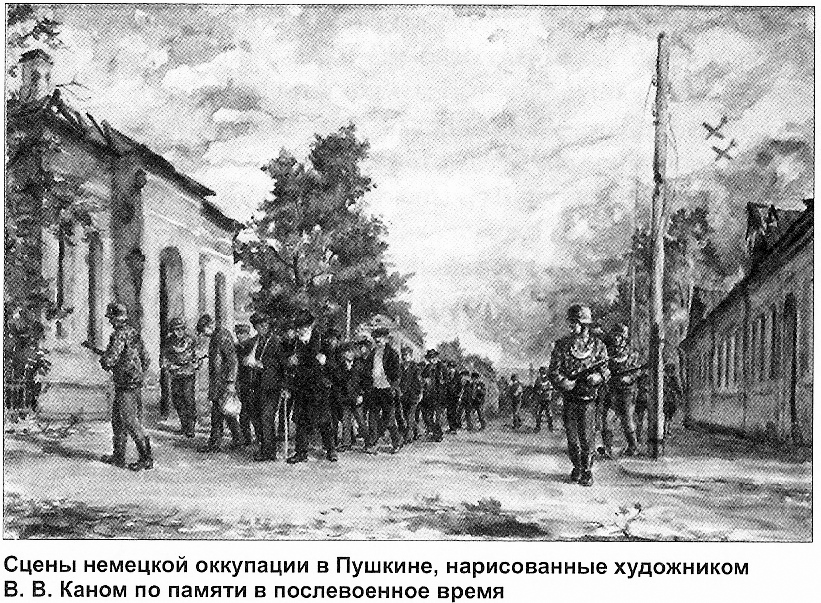 Немцы вошли в Пушкин в ночь на 18 сентября 1941 года. Расстрелы евреев начались сразу же: их вылавливали из подвалов, склоняли людей выдавать своих соседей, суля им за это вещи казненных. Когда начался голод, за одного выданного еврея предлагали полкотелка супа. Но основную массу еврейского населения, включая стариков и грудных детей, собрали у комендатуры. Местные жители запомнили, как эту колонну примерно из 800 человек вели на расстрел в парк и как обреченные люди шли и пели печальную песню. Точные места захоронений неизвестны, но есть много свидетельств о местах, где людей заставляли копать рвы, расстреливали и закапывали: это и Розовое поле, и Лицейский садик, и Каприз, и Александровский, Баболовский и Екатерининский парки, и Черные болота, и военный аэродром. Есть свидетельства о том, что около 670 человек закопаны во дворе 3-й школы, около 500 – у Белой башни в Александровском парке.