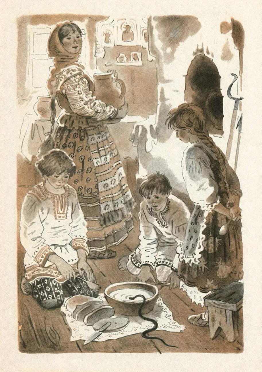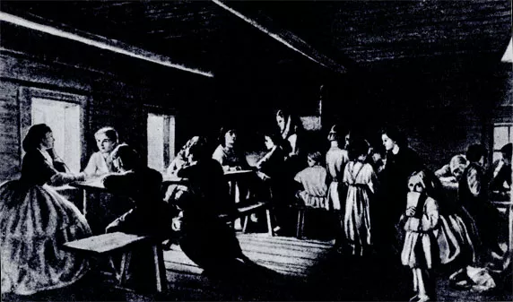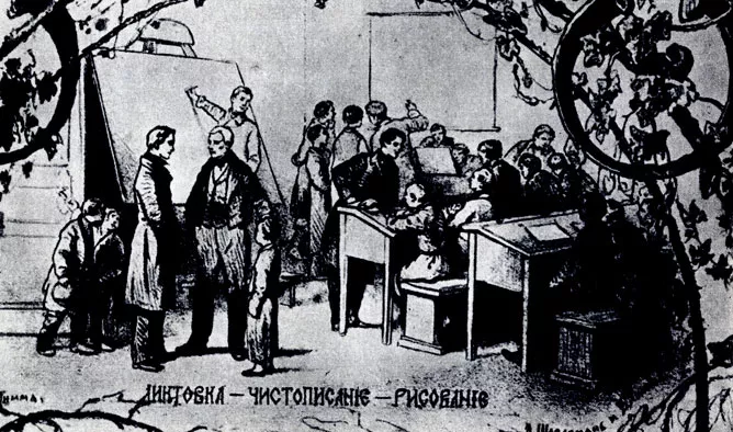 Бесплатная сельская школа 60-х годов XIX ст. Картина художника А. МорозоваПриведем развернутую формулировку: «Глубокие, задушевные принципы патриархального быта, чуждые, с одной стороны, юридической строгости римского права, более или менее легшего в основу быта западных народов, а с другой — меркантильной жестокости и расчетливости; преобладание то льющегося неприметным ручьем, то расстилающегося широкой рекой славянского чувства, порывистого, неровного, но имеющего достаточно силы, чтобы иногда одним натиском вынести человека из самой глубины нравственного омута на вершины человеческого достоинства; необыкновенное обилие инстинктов, скорее угадывающих, нежели изучающих; необыкновенная, изумляющая иностранцев восприимчивость ко всему чуждому, льется ли оно с Востока или Запада, и вместе с тем стойкость в своей национальности, хотя часто бессознательная; наконец, древняя православная религия с ее всемирно-историческим значением, религия, превратившаяся в плоть и кровь народа, — вот что должно проявиться в народности русского воспитания, если оно хочет сделаться действительным выражением народной жизни, а не насильственным, чуждым народности подражанием».