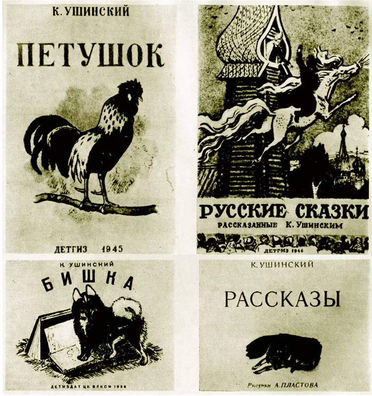 Книги Ушинского для детей, изданные после революции. Обложки работы художников Е. Чарушина, А. Лаптева, А. Комарова, А. ПластоваИнтересно, что Ушинский вооружается и против математики — второго столпа классического образования: «Школьный же опыт показывает нам странное явление: молодые люди, с любовью и успехом занимающиеся математикою, чаще всего оказываются мало способными к другим наукам, особенно к словесности и истории. На математиках-специалистах весьма часто во всю их жизнь лежит какой-то странный оттенок ограниченности, и нередко с глубоким знанием математики уживаются в голове самые дикие, уродливые фантазии и упорнейшие, ограниченнейшие предрассудки. Математика изучает только формальную сторону мира и только формальным образом развивает человека». Будучи согласен во всем с Пироговым, Ушинский расходится с ним только в понимании гуманизма и реализма (т. е. во всем). Потому первое место в его идеальной программе отводится родному языку, затем — предметы, раскрывающие человека и природу, а на третьем месте — новые языки. Древние нужны только как элемент одной специальной области.