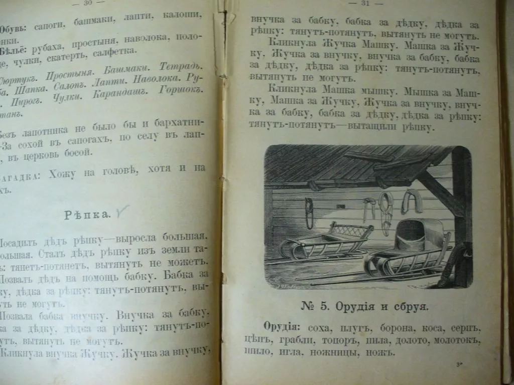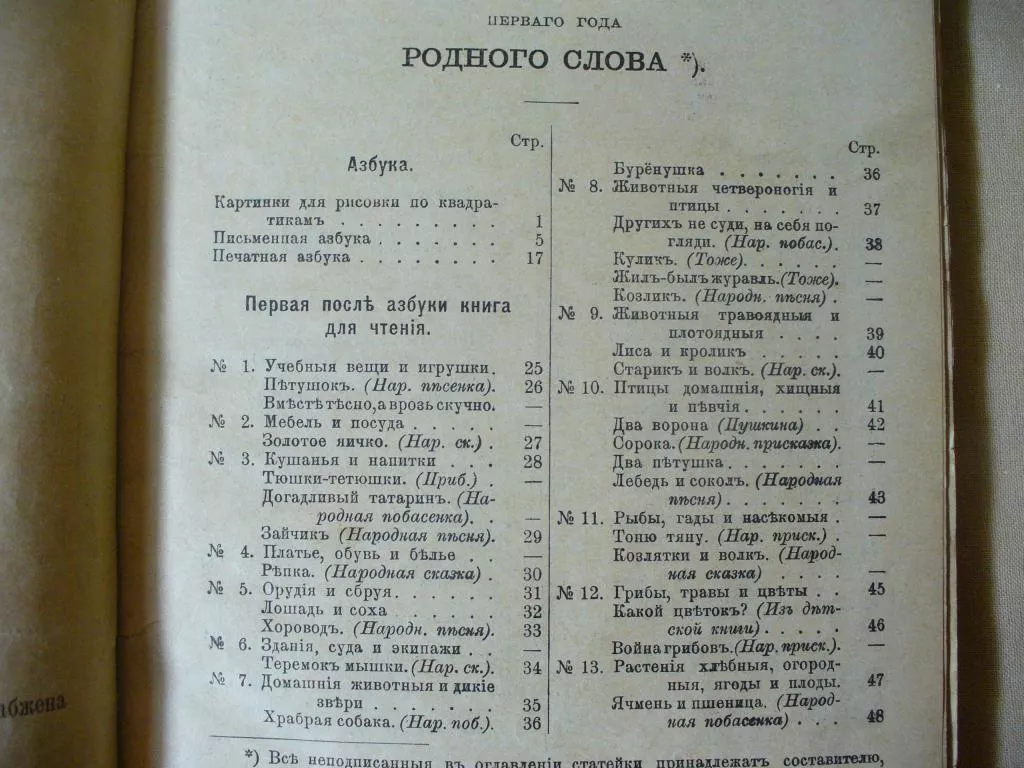 «Но несравненно важнее, чем вопрос об усвоении азбуки и механизма чтения, — вопрос о первой книге, которая дается в руки ученикам наших сельских школ. Для этой цели почти повсеместно употребляется „Родное слово” Ушинского, книга замечательная, единственная в своем роде в нашей литературе... Но, к сожалению, книга эта писана для детей иного возраста (7–10 лет) и иного сословия, чем ученики наших сельских школ. Пользуется она в нашем официально-педагогическом мире авторитетом почти каноническим, и поэтому добросовестно и безжалостно употребляется в наших министерских училищах.